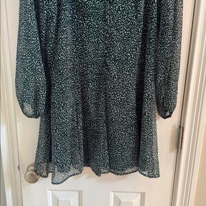 Chic long sleeve dress with a subtle pattern. Perfect for versatile styling. Dress looks like silk, but isn't and has a hunter green lining. Dress has coveted buttons down the front, five of which may be unbuttoned and ten which are decorative. Approximate measurements laying flat are as follows: armpit to armpit - 19"; waist -