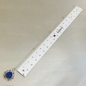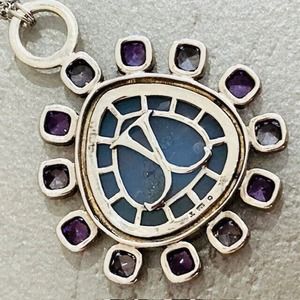 - Pendant features blue druzy central stone with pave' marcasite edging & blue & purple crystals