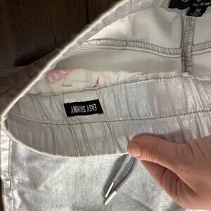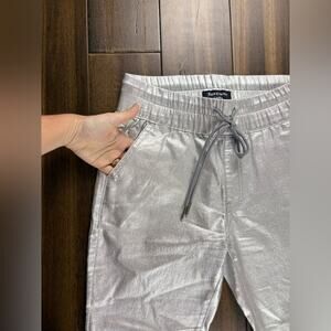 Metallic silver joggers pull-on pants with elastic waistband, pockets, and drawstring. Brand new, never worn! Size 26