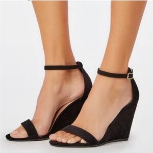 New JustFab Saba black suede 4" wedges with ankle straps, brand new without tags, no flaws. *Stock photo used in 2nd photo