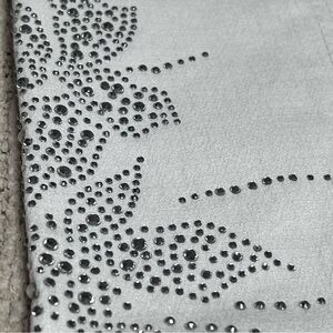 Right leg has floral rhinestone embellishments on outer side from the knee down