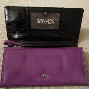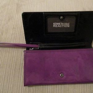 NWOT Kenneth Cole Reactions purple patent leather wristlet with a retractable handle, wristlet, clutch, wallet snap closure, outside pocket on back. Lining is made of black faux patent leather and nylon fabric, compartments include ID' photo section, paper money sections, credit card holder, zippered coin section, paper money, papers. Large oval metal zipper pull. You can pull the wristlet strap out or keep it pushed in. Length 4& 1/2 inch. Width 8 & 5/8 inch. Length when open 9 & 1/4 inch