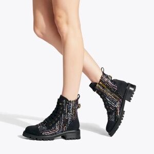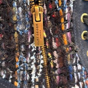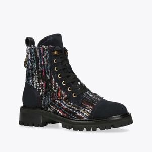This pair of Kensington Combat boots feature a black leather upper with tweed fabric on the ankle. The back of the ankle features an antiqued brass eagle head below a small pull tab.