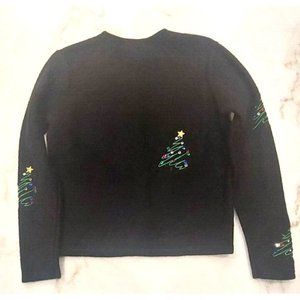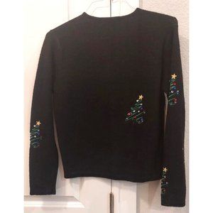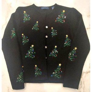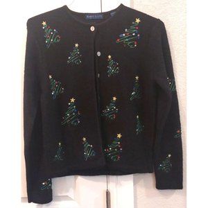 This gorgeous Karen Scott blazer in size PS is perfect for the holiday season or any casual occasion. Made with 100% boiled wool, the blazer has a short length and button closure. The black blazer features a Christmas tree pattern and accents of buttons, sequins, and embroidered designs. The blazer is perfect for petite women and has no lining material. It is a classic piece that will never go out of style, especially during the winter season.