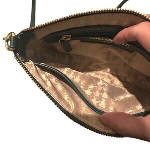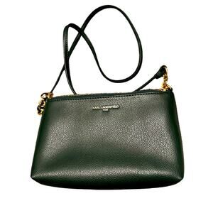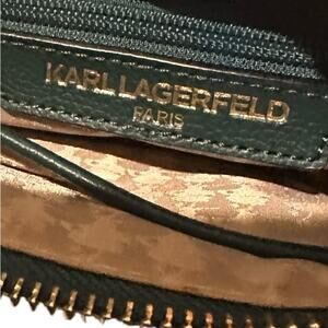 NWOT Karl Lagerfeld Paris Crossbody Pebbled leather in Dark Teal. Top zip. Two inner pockets. One zip, one without. Gold detailing on strap and logo. Inside open pocket is 5" deep and 7" wide. Zipper compartment measures 3x5". Please see photos for exterior measurements.