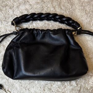 Chic black leather bag with braided handle. Stylish and versatile for any outfit.