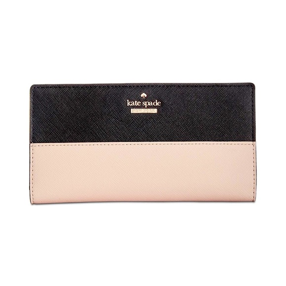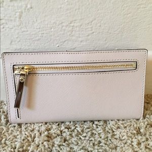Leather with saffiano trim Snap closure Slide pocket, currency pockets, 12 card slots and ID window inside Back zip pocket outside Approx. 3.5 x 6.6 x 0.5"