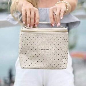New without tags. Lightly creased due to storage. NWOT Kate Spade Lunch Tote Insulated Preppy Polka Dot Compact. Beige off white color with subtle natural texture pattern and black polka dots. Super cute!
