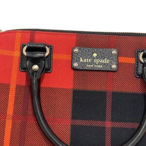 kate spade handbag, plaid dome satchel, wool and leather bag, red plaid purse, black leather trim bag, designer handbag, kate spade purse, luxury satchel, zip closure handbag, plaid accessory, classic plaid bag, kate spade red bag, stylish everyday bag, holiday, gift, birthday, present,