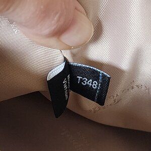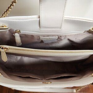 This bag is gorgeous. It’s a neutral color, so it goes with everything, and the style is very glamorous. It’s in pristine shape and still has some packing protection in a few places. The gold-tone hardware is shiny and new, it has chain double handles and dual inside compartments with a zippered compartment in the middle. The leather is soft with a little shine to it. Not a spot on it.