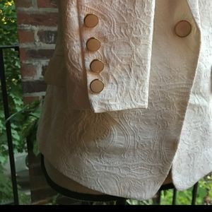 Size xs Cream colored blazer w/4 buttons on the sleeve and one in front. Never worn. Length from shoulder - hem 22" armpit - armpit 17" sleeve length 23" shoulder 13.5 laying flat.