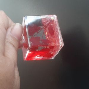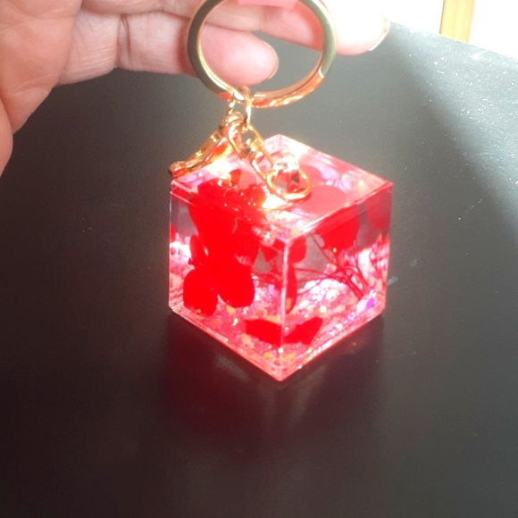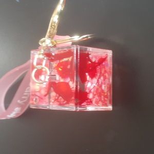 NWOT bread and pink glittery keychain with red leaves inside along with the glitter. dice shaped
