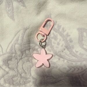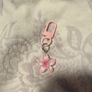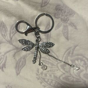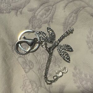 Half off when bundled with two purses or wallets. Charming keychain set featuring a pink flower, a red strawberry, and a silver dragonfly with sparkling accents.