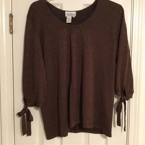 NWOT Is This Vintage y2K Beautiful Brown With A Subtle Metallic Threading Throughout The Fabric & Bow Sleeve Top By Kim Parish Collection . The Fabric Is Silk & Cotton With Metallic Thread. Not Tok Dressy Will Go With Jeans Or Dress It Up. Please See Pictures Of Tag. I Purchased From QVC Many Years Ago & Is Soo Cute. See photos please. I Love the Bow Details on Each Sleeve & Rounded Neckline So Flattering On, The Top Is In Pristine Condition. The Chest measures 23” Pit to Pit, & Full Length Top. Fits True To Size , Machine Wash , TY