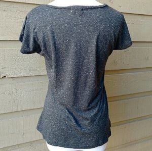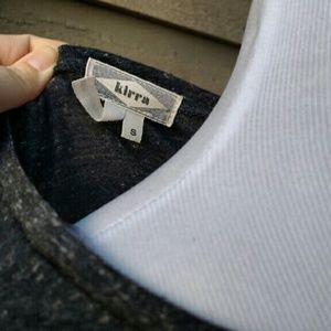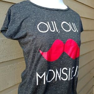 NWOT Kirra grey graphic tee size S. This piece is in great condition, never worn. The shirt is grey with white mixed in. The writing is white and the mustache is red. The shoulders are 7 inches. The pit to pit is 18 inches. The whole piece is 23 inches. The material is 85% polyester and 15% linen.