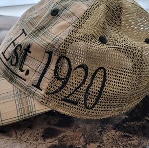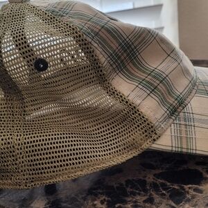 Plaid baseball cap with Knott's Berry Farm logo. Features green and beige tones.