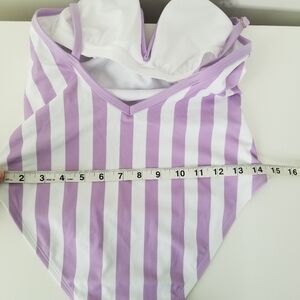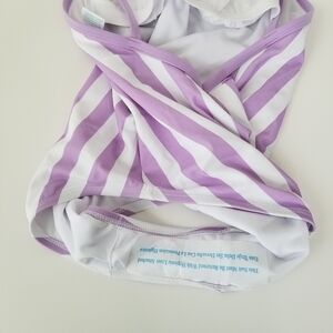 New with out tags Kona Sol V neck Over the Shoulder high leg one piece swimsuit in a size small. Purple and white striped print.