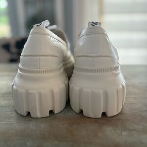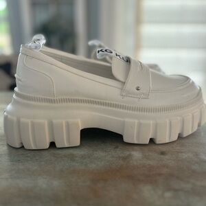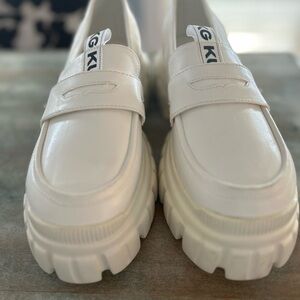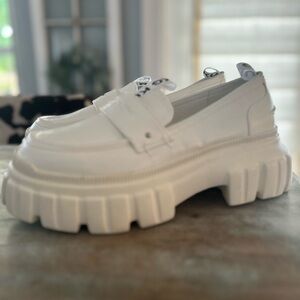 NWOT Kurt Geiger white chunky loafers, vegan, all man made materials. Lug soles, women’s size 38.5, black lettering. No box.