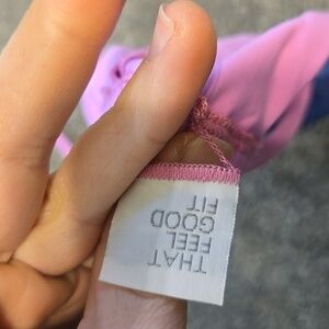 Stylish bikini top in blue and pink. Features a unique design with adjustable straps.