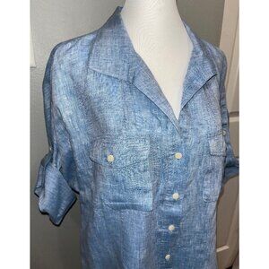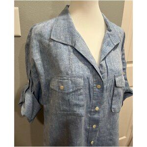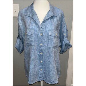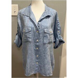 NWOT LAFAYETTE 148 Button Down Shirt, Blue, Roll Tab Sleeve, 100% Linen, Size 14
