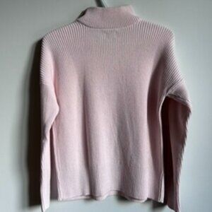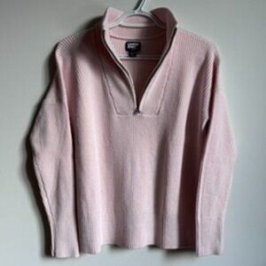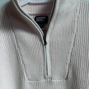 Pale pink quarter zip pullover sweater by Lands' End. Ribbed knit with subtle stitching pattern detail around the zipper.