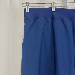Elastic waist, hand pockets, high rise, generous 9" inseam, lined. Navy blue.