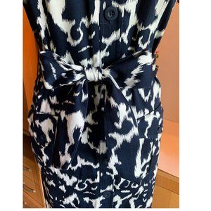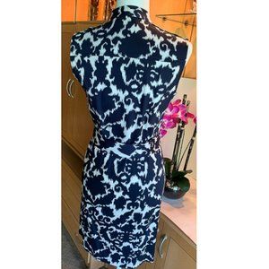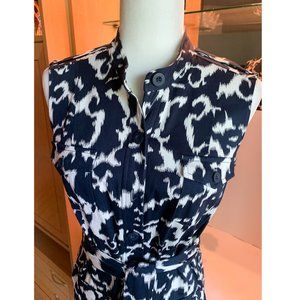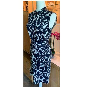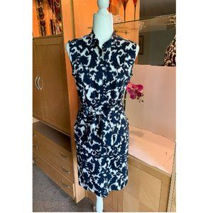 NWOT - Sleeveless button-up knee length dress by LENNIE FOR NINA LEONARD. Navy blue and eggshell white. Matching belt to tie in knot or bow. Shoulder to hem 37" Bust 38" Waist 33" Hips 37". Nine front buttons from neck to hem. Two small breast pockets with with buttons, Two side pockets with buttons. Epaulettes on shoulders. Fabric is Cotton and Spandex. Unlined. Machine wash gentle cycle hang dry. PERFECT. No tears, holes, stains, discoloration, stretched seams, loose threads, pilling, odor.