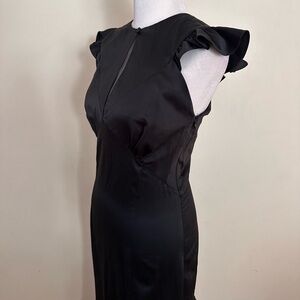 LES RÊVERIES Ruffle Trim Satin Gown in black. Look as fetch as ever with this satin gown! Featuring a flattering empire waistline, which ends the daring split neckline with button-and-loop closure, complete with an eye to detail with ruffles capping the sleeves and trimming the alluringly slit skirt. This outfit has a hidden side-zip closure. Show off that skin in a subtle, but the best way possible with a thigh-high front slit!