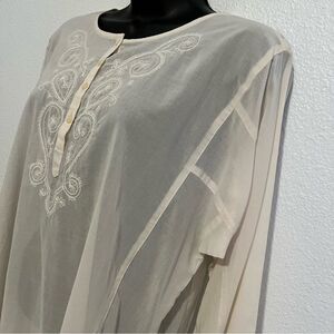 NWOT LIZ CLAIBORNE Boho Cottagecore Beach Neutral Ivory Cotton Embroidered Split Neck Button Split Hem Tunic Semi Sheer Blouse