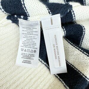Classic Breton stripes with a modern twist. This LOFT mock-neck sweater features nautical navy stripes on an ivory base, a chic button-shoulder detail, and cozy ribbed collar/cuffs/hem. Medium-weight cotton-blend knit—perfect for work, weekends, and coastal-prep styling. Easy to dress up with trousers or keep casual with denim and white sneakers.