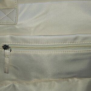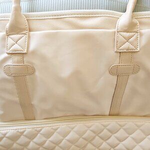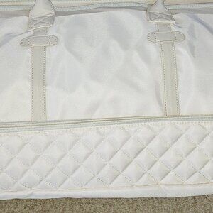 LOULU Weekender Travel Bag in Ivory with Handy Charging Cord for Phone or Tablet featuring an Adjustable Shoulder Strap and Interior Pockets This Bag is PERFECT for an Overnight Trip, Spa or Workout Session BRAND: LOULU COLOR: Ivory FEATURES: Logo Privacy Panel Luggage Tag; Charging Cord for Phone or Tablet; Double, Padded, Adjustable Shoulder Strap; Double Strap Handle for Ease in Carrying; Exterior Zippered Compartment; Six Interior Pockets for Item Storage; Quilted Water Resistant Zippered Bottom Compartment for Shoes, Toiletries or Damp Clothing APPROXIMATE MEASUREMENTS: 22 inches long; 11 inches high; 9.5 inches wide FABRICATION: 100% Polyester CONDITION: New in Original Packaging