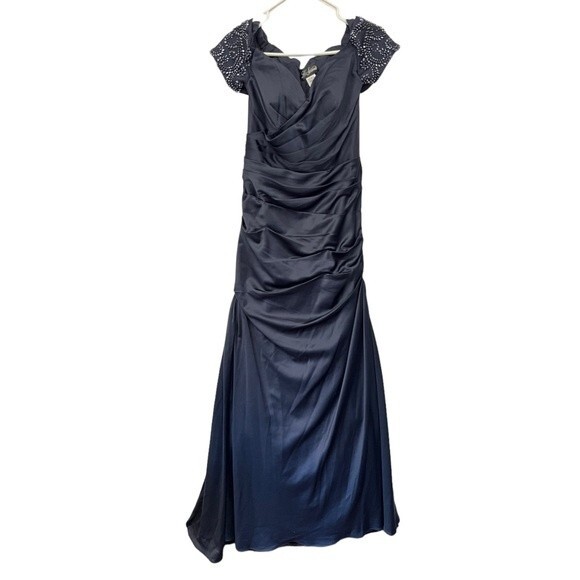 NWOT La Femme | Navy Ruched Beaded Short-Sleeve Formal Elegant Long Gown 8
