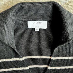 New without tags! La Ligne NYC 100% cotton sweater with spread collar. Boxy, relaxed fit in black and tan stripe. Perfect with jeans for the weekends this fall or pair with black trousers and a loafer for the office. Approx 23.5” long, 23.5” armpit to armpit.