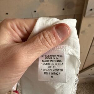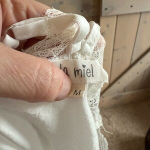 Stylish top with intricate lace trim. Ideal for any occasion. Racerback with adjustable straps. Lace trim at neck and hem. Never worn.