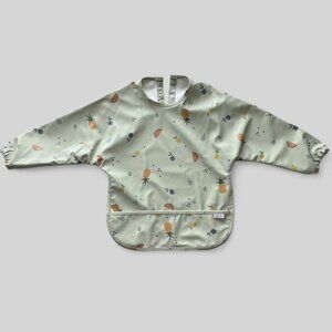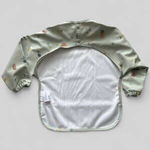NWOT Lalo long sleeve bib smock for toddlers 12mo–3T in sage green with a fun fruit print design. Features tapered sleeves, two button closure on back, and waterproof fabric to keep clothes clean during meals, crafts, or play. Lightweight, easy to wipe clean, and perfect for everyday use.