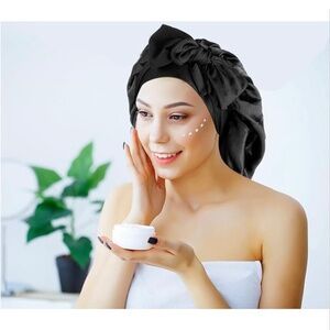 NWOT Large black satin sleeping bonnet. Elegant, very comfortable and great for protecting hair from friction and snags. Elastic band and bow tie.