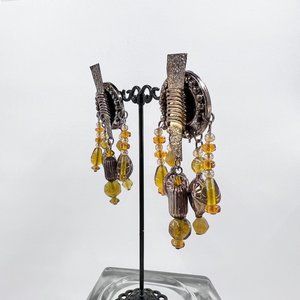 NWOT - Large Yellow Beaded Antiqued Gold Statement Chandelier Clip Earrings