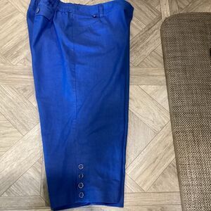 New without tags. Larry Leung brand Women’s capris in size 20W in Royal Blue. Front zipper and metal closure - inside button is missing and one metal clasp as well.. Two front working pockets and two working back pockets. Waistband is elasticized at both sides. Showing photos of front and back sides along with fiber contents and care information. Inseam of 20”.