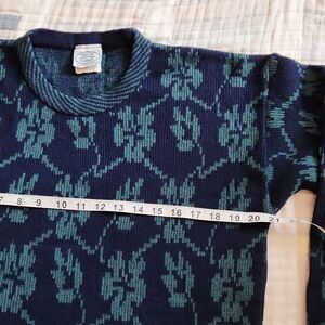 Laura Ashley Vintage Scotland 100% wool floral crewneck, dropped shoulder pullover sweater in navy and shade of green