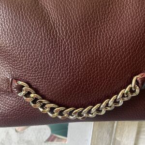 Supple cordovan color leather with a silver chain accent.