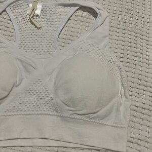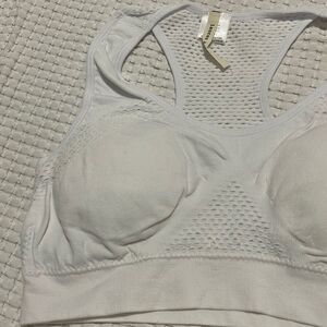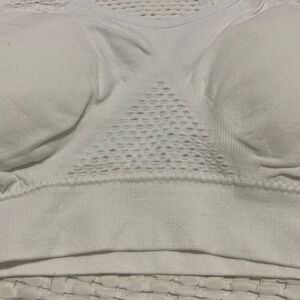 White, soft stretchy sports bra, removable pads, patterned breathable design