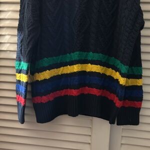 Funnel neck, heavy cable knit pullover sweater, with rainbow stripes all around sweater and sleeves