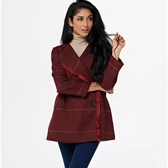 New without tags Laurie Felt Zoe plaid wrap coat. Dark red with black and a tiny bit of brown. Measures 24” from armpit to armpit and 30 1/2” long.
