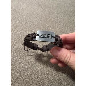 This is a brown leather bracelet with a Silvertone etched piece highlighting the center. This bracelet has that also leather a smell and opens and closes easily adjusting to most wrist sizes. There are several available.