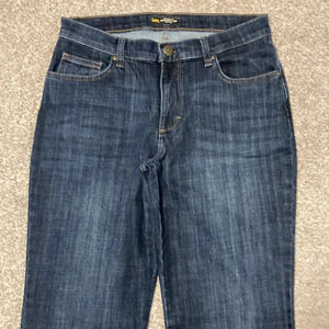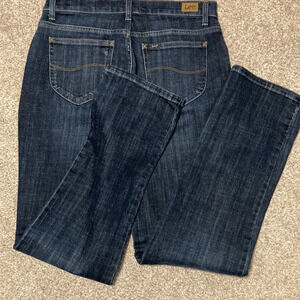 NWOT Lee Relaxed Fit Straight Leg Mid Rise jeans in size 10 long. Excellent new condition. Traditional 5 pocket style with zipper and button front closure. Dark wash denim is 75% cotton, 24% polyester and 1% spandex. Please see photos for approximate measurements laying flat and details. From smoke free and pet free home.
