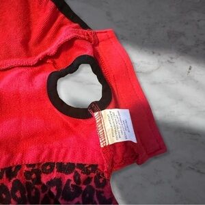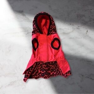 New, never used, without tags small dog hooded dress. Leopard print details. Ruffle trim. Drawstring capability at waist. Hole to allow leash/harness connection. Velcro closure under belly. Color: fuchsia/black. Size XS