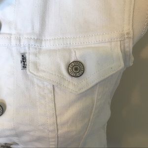Iconic double stitch 6 button down trucker vest. 2 pocket front and adjustable 4 button closure hem in the back. A must have staple for the summer. Sz XS/TP. 99% Cotton 1% Elastane.