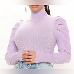 Stylish lilac ribbed bodysuit with a turtleneck design. Perfect for layering or wearing alone. Pit to pit 16” Sleeves 27” Length 29”