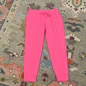 Never worn. Lightweight bubblegum pink lounge set. Inseam on the pants is 27.5”. Hem on pants is banded. Top is loose with a slight “high/low” split side hem. Boat neckline. Pristine condition!