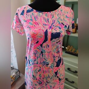 NWOT Lilly Pulitzer Marlowe in the sand bird print pima cotton shirt dress. Embrace a vibrant resort vibe with this pink sundress, showcasing a lively pink Marlowe head design. The short sleeves and crew neck add a touch of elegance to this casual mini dress, making it a perfect choice for sunny getaways. Size XS